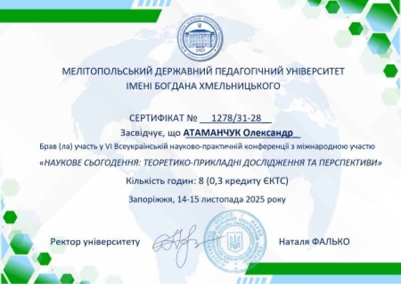 Здобувачка освіти групи ГРС 5 Ірина Шлапак педагогічний керівник Олександр Атаманчук стали учасниками Всеукраїнської науково – практичної конференції з міжнародною участю «Наукове сьогодення: теоретико – прикладні дослідження та перспективи», яка проходила 14-15 листопада 2025 року на базі Мелітопольського державного педагогічного університету імені Богдана Хмельницького.