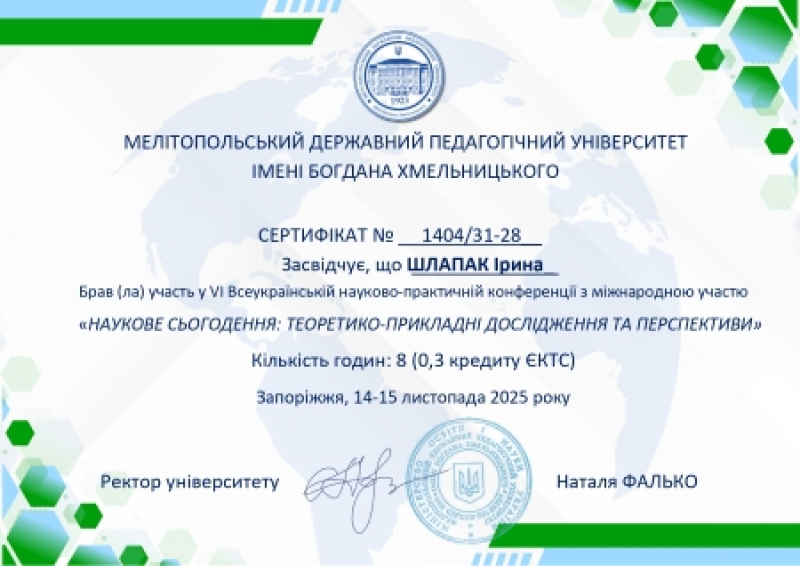 Здобувачка освіти групи ГРС 5 Ірина Шлапак педагогічний керівник Олександр Атаманчук стали учасниками Всеукраїнської науково – практичної конференції з міжнародною участю «Наукове сьогодення: теоретико – прикладні дослідження та перспективи», яка проходила 14-15 листопада 2025 року на базі Мелітопольського державного педагогічного університету імені Богдана Хмельницького.